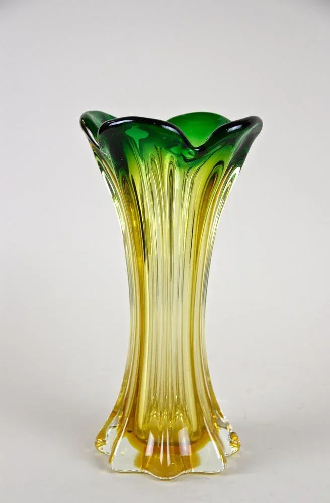 工芸品 Murano Glass Vase (Green & Yellow) Mid-Century Italian Vase in Green Yellow Murano Glass, 1960